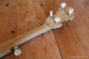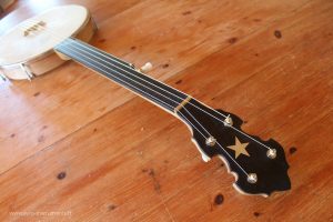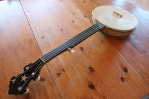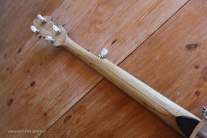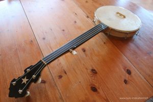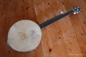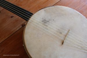 Un banjo fretless 5 cordes nylon avec manche en châtaignier et un tambourin qui fait office de caisse de résonance.